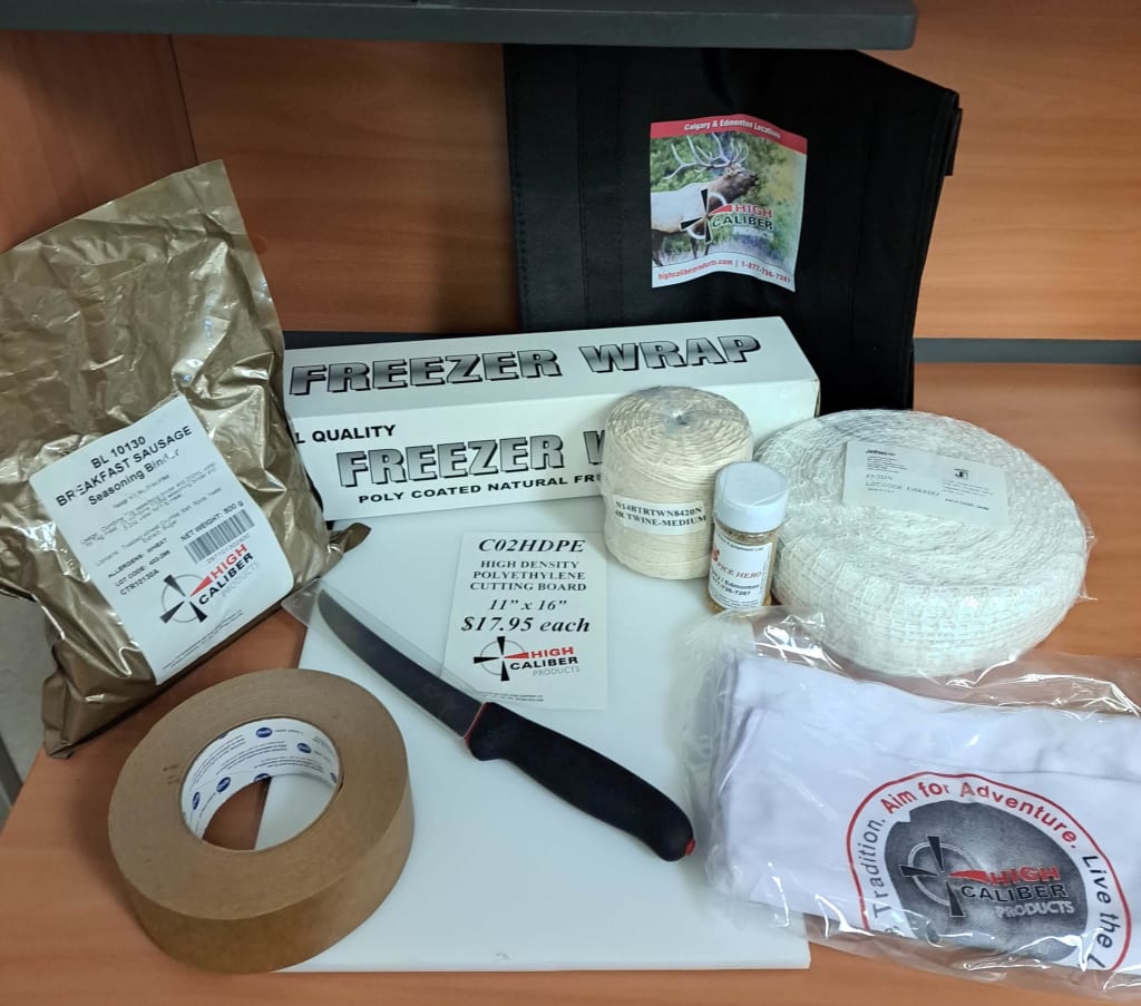 Butcher Paper, Tape, Twine, Netting, Cutting Board, 6" Boning Knife, Spice Rub, Hat, Apron, reusable bag