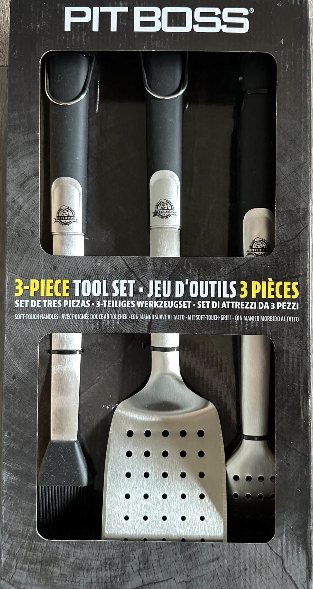 The Pit Boss Soft Touch 3-Piece Tool Set has all the essentials to make you the boss of the grill. This handy set includes one pair of locking tongs, one slotted spatula, and one silicone basting brush. Each tool has a heavy-duty stainless body and soft-touch handle for long-lasting, comfortable use. They each feature enlarged hanging loops so your tools can stay right within reach. Grilling up your favorite recipes just got easier with this dependable bbq grill toolset.'