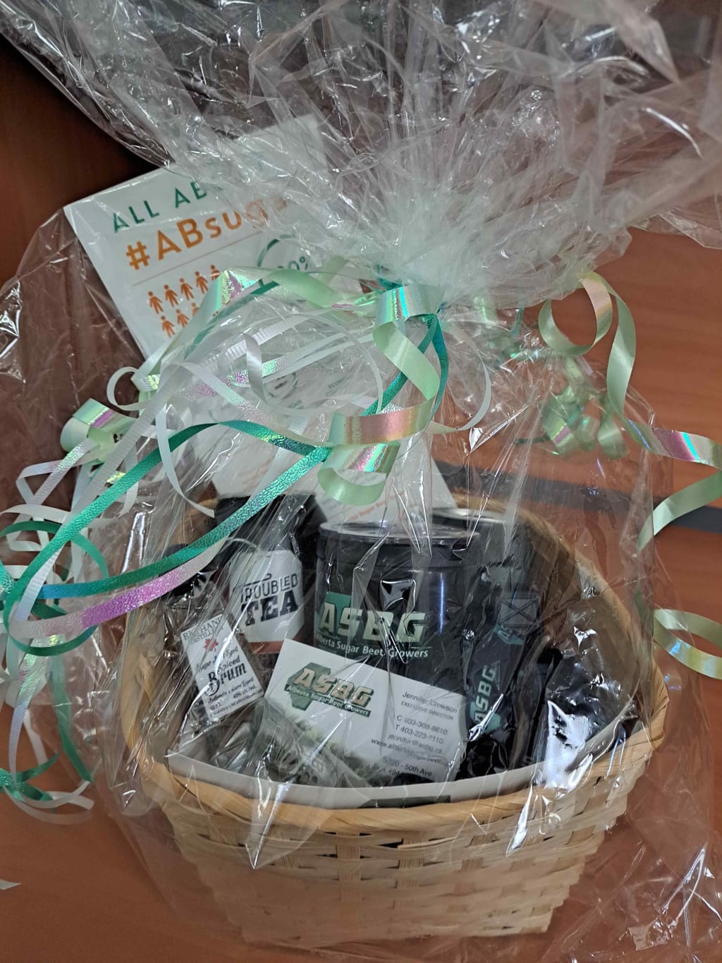 Gift basket with spiked Tea, Rig Hand spirits, Tumbler, shot glass and lanyard from Alberta Sugar Beet Growers