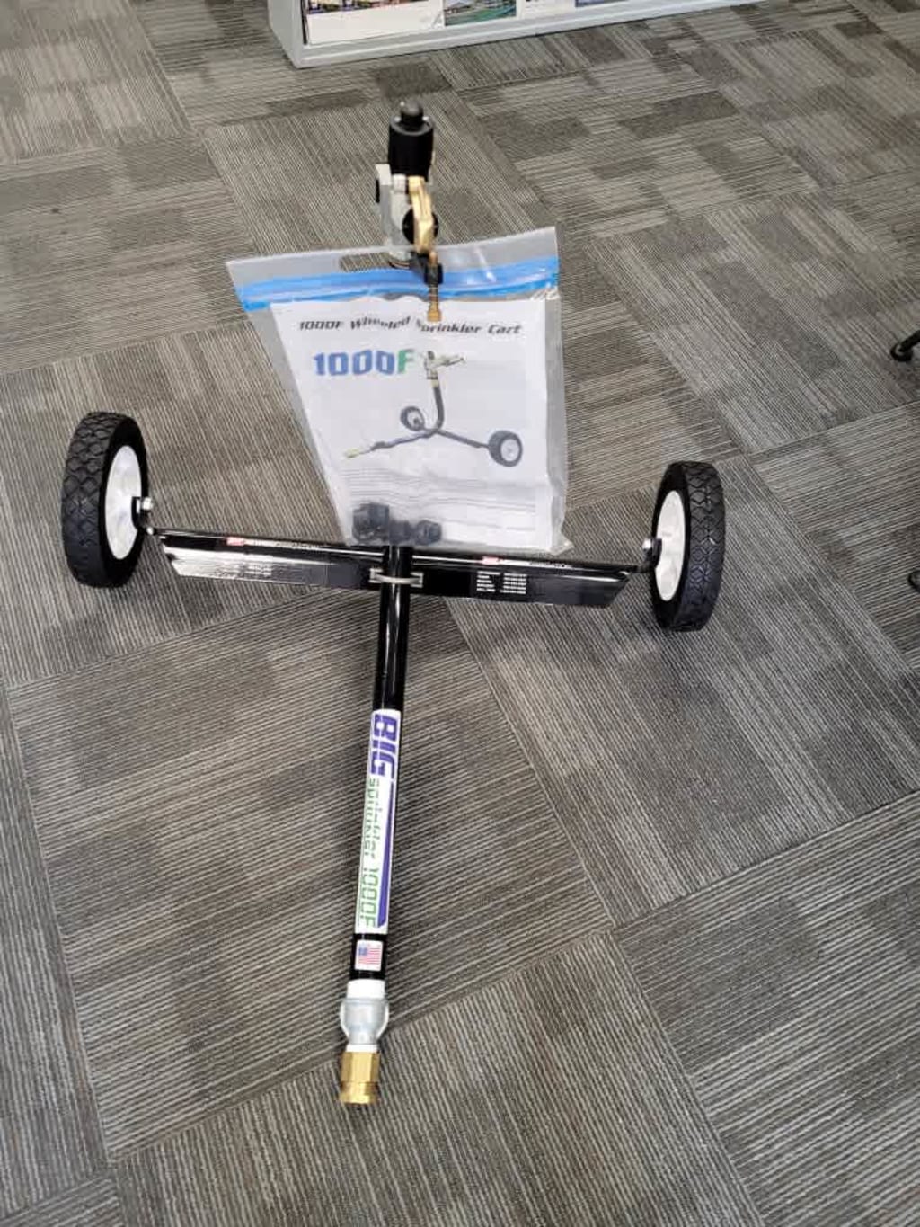 1000F-Heavy Duty Sprinkler Cart is constructed with a 1" heavy gauge steel pipe, a solid 1.5" steel axle for weight (25 lbs), and a durable "baked on" powder coat finish. It also comes standard with a ¾” brass garden hose swivel and commercial grade Impact Sprinkler head (flow range 5 to 25 GPM) that can be set to a full or part circle spray pattern with area coverages up to 120 feet in diameter.