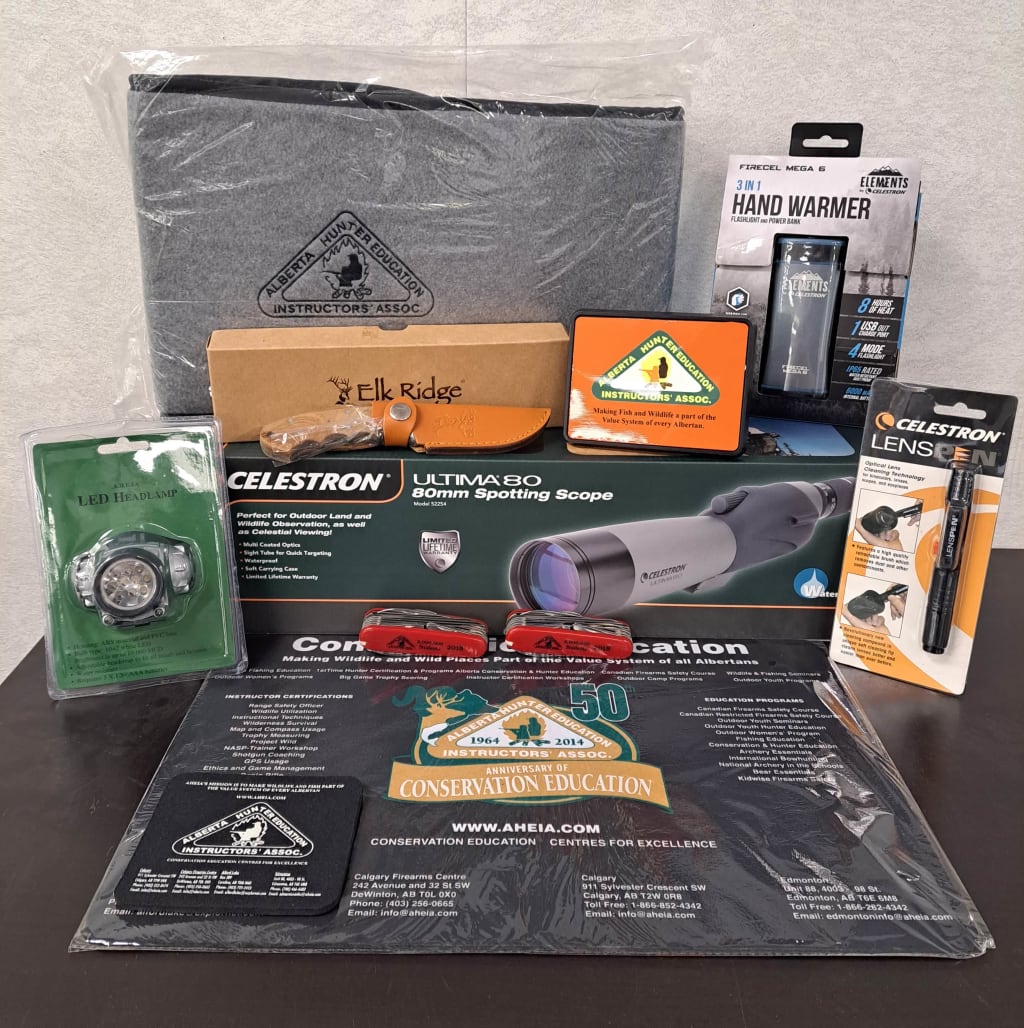 Celestron Ultima 80 Straight Spotting Scope, Lens pen, Firecell Mega 6, Headlamp, Elkridge knife, AHEIA gun sleeve, handgun mat, coaster, hitch cover and 2 pocket knives