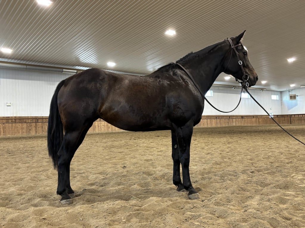 Beauty is a black 4 year old grade mare with 30 days with a professional trainer. Beauty has good confirmation and good feet, good for farrier, good to catch and tie. Has had 1 foal abd was a good mom, easy to be around, good manners not a mean bone in her body. Good in herd, mid to low pecking order. Will make someone a good project.