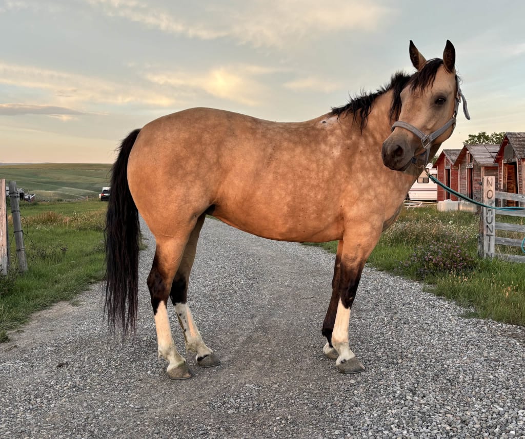 Nugget 6 year old grade buckskin mare has had over 6 months professional training, lots of arena miles and outside miles and has been roped off, moves nice. Sensitive type mare needs an experienced hand as she has bucked before. Been shod but used sedation. Ready to go to work and best if used consistently.