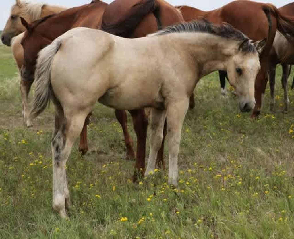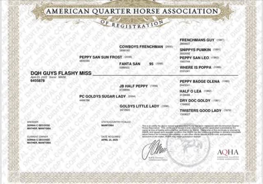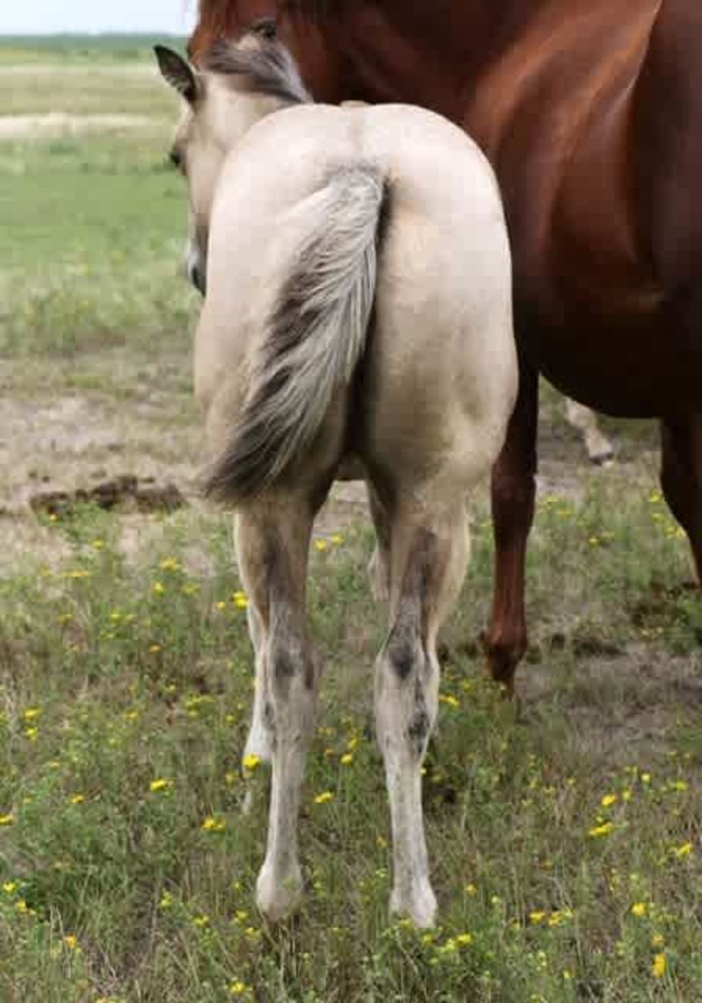 Here is a buckskin filly that is sure to catch your eye and is sure to excel in many directions. Peppy San Sun Frost aka Cooper has been producing great minded foals for us that have excelled in the barrel and roping pen as well as solid ranch and family mounts. This fillies dam is a DQH Mia Rooster Two aka Jagger daughter. Jagger has been making a solid name for himself as the sire of well built good minded babies that do well in many directions. He is a money earner himself before an injury at the trainers sent him to the breeding pasture. His sons and daughters have picked up the gauntlet and carried on in his name. A son was the 2024 MHSRA horse of the year and he has other sons and daughters excelling in the team roping and breakaway roping all across Canada and the States. This filly is built right and has the proven genetics to be a future contender in any arena you send her to.All of our Prospects will be eligible to be paid into the Legends of the Prairie Rope and Barrel Horse Futurity. For More Info contact Donna at hm-204-529-2515 cell-204-245-0655 www.decossequarterhorses.com.