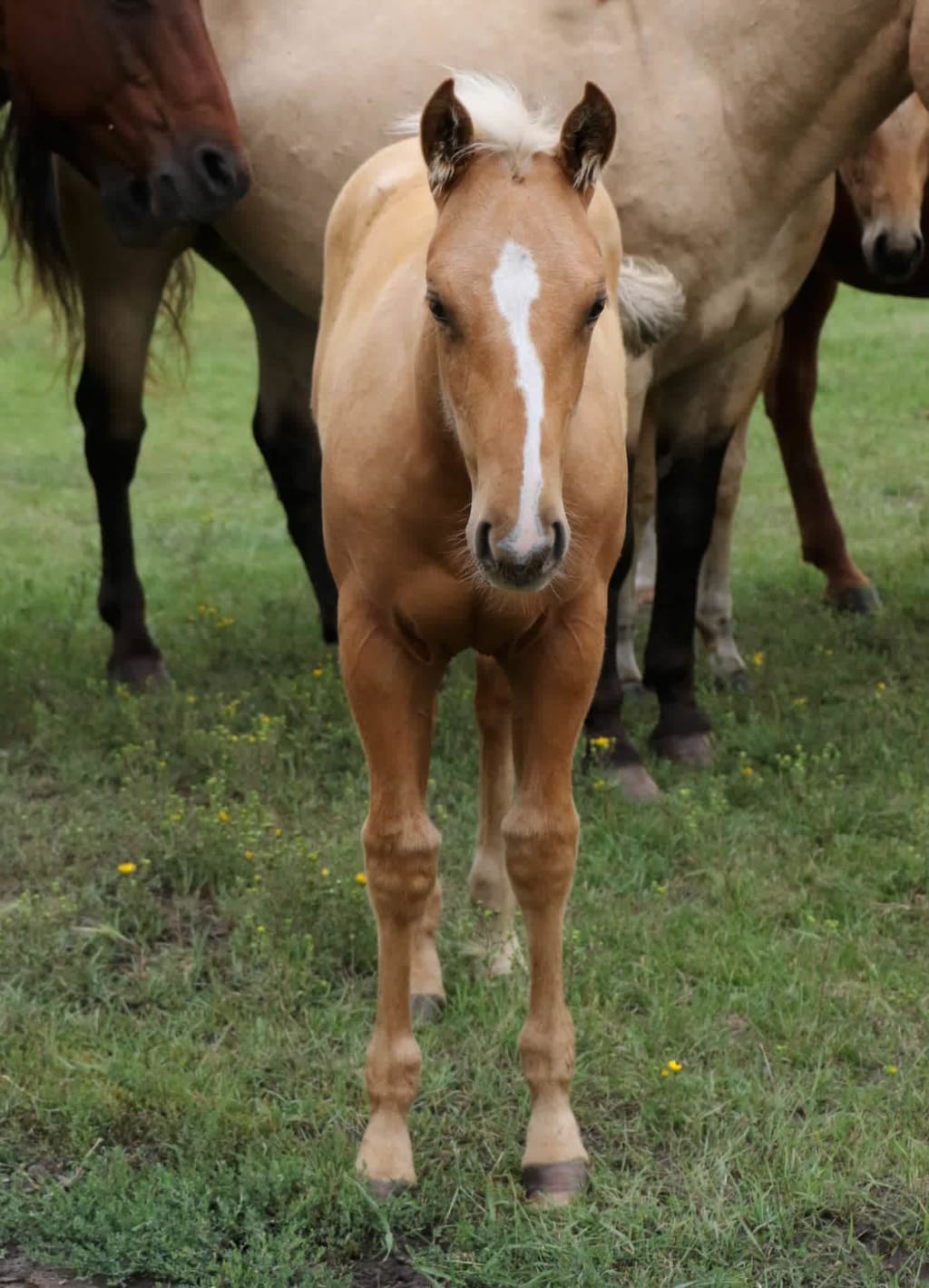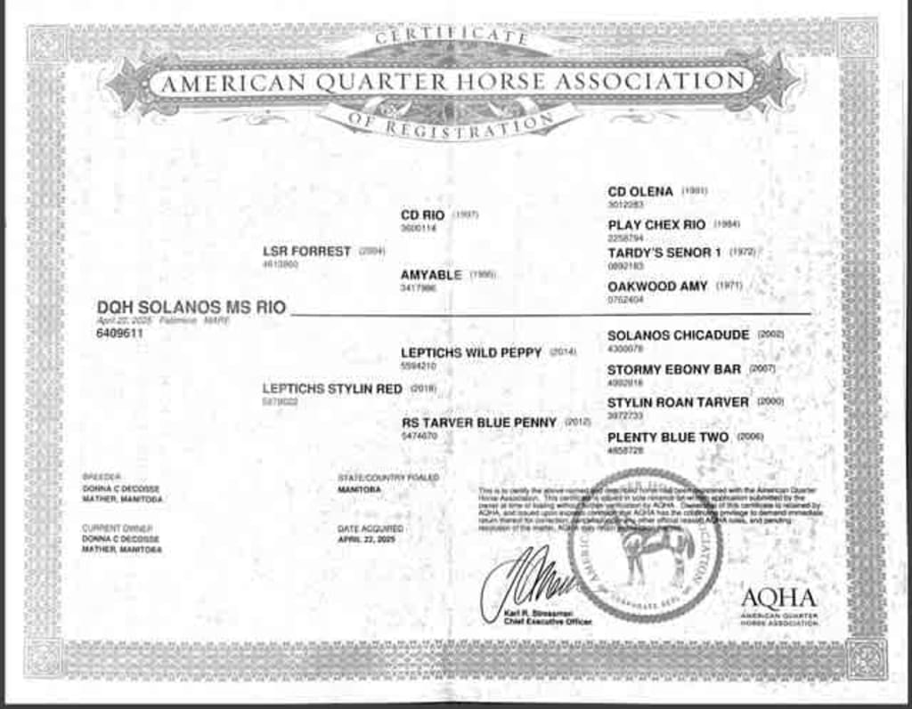 This big palomino filly is sure to please in any direction you plan to take her. We bought this nice mare that came out to the Leptich Family Program and we are happy with the great foundation breeding she brings to our program. This is the first year crossed on one of our stallions and we are very pleased with this beautiful LSR Forrest filly LSR Forrest is our senior stallion and he passes his great mind, foot and bone to his foals. This filly is no exception. LSR Forrest has get competing in Pro Rodeo team roping, Three day Eventing, Reining, and all round family ranch horses. The two daughters that I have retained are super broodmares and are a great cross on our Jr Stallion Jagger. This filly has a quiet friendly nature and is built to do any job you can throw at her. We are excited to see how she develops over the coming years All of our Prospects will be eligible to be paid into the Legends of the Prairie Rope and Barrel Horse Futurity For More Info contact Donna at hm-204-529-2515 cell-204-245-0655 www.decossequarterhorses.com.