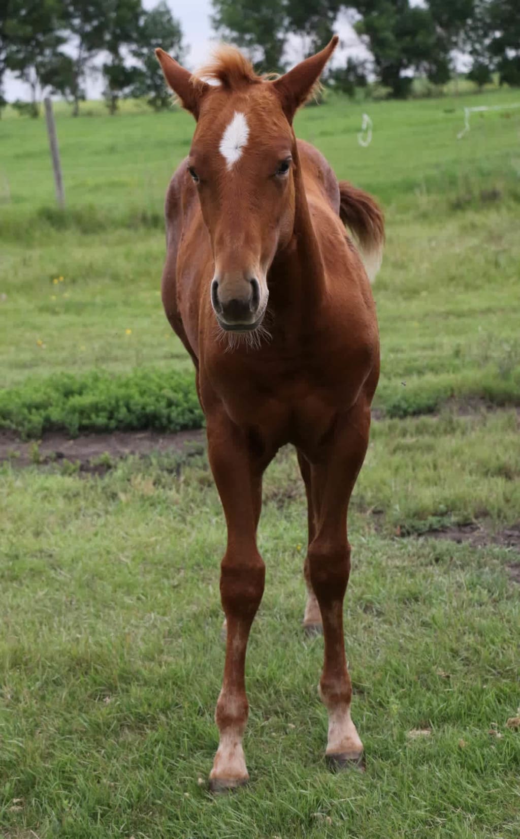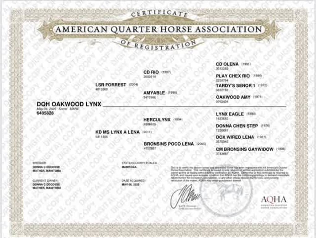 What a big strong girl this striking filly is turning out to be. She is SOLID with the bone and foot she has inherited from her sire LSR Forrest and should have some good height passed down from her dam who is one of our bigger mares. She goes back to Doc's Lynx and PC Bronsin on the bottom side which has crossed well on our LSR Forrest stallion over the years. This filly should be an asset to any ranch or family program. She will be able to drag a calf to the fire all day long and then go and play on the weekends. All of our Prospects will be eligible to be paid into the Legends of the Prairie Rope and Barrel Horse Futurity. For More Info contact Donna at hm-204-529-2515 cell-204-245-0655 www.decossequarterhorses.com
