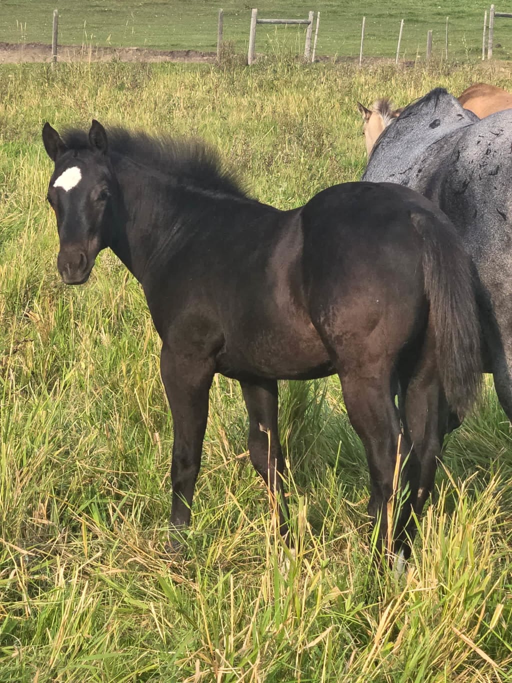 This colt is coal black, very correct and will turn heads every where he goes. Stop by his pen for a look. His siblings have went onto every discipline out there. He will make someone a very nice gelding he will be very athletic.
