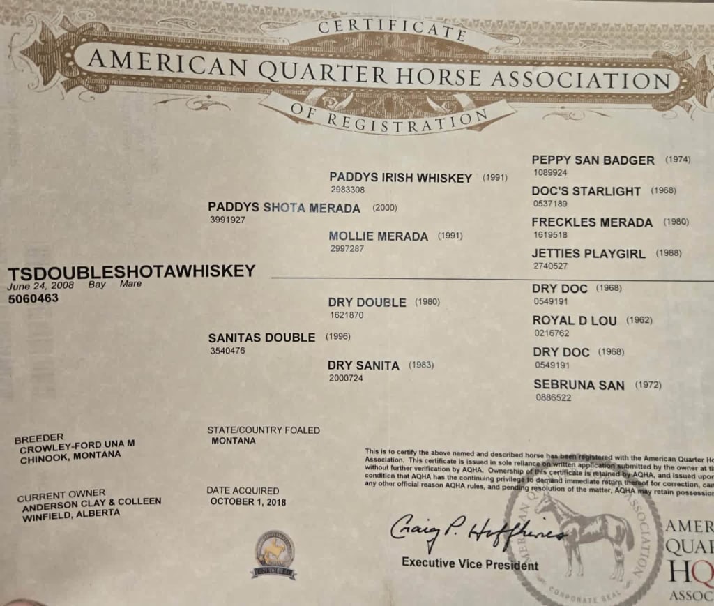 Cow horse deluxe. This filly is out of a PADDYS IRISH WHISKEY bred mare also her dam has DRY DOC on her papers. This filly will work in any discipline but would really excell in the reining cow pen or as a top heel horse. Note registration papers attached are the fillys Dam and Sire.