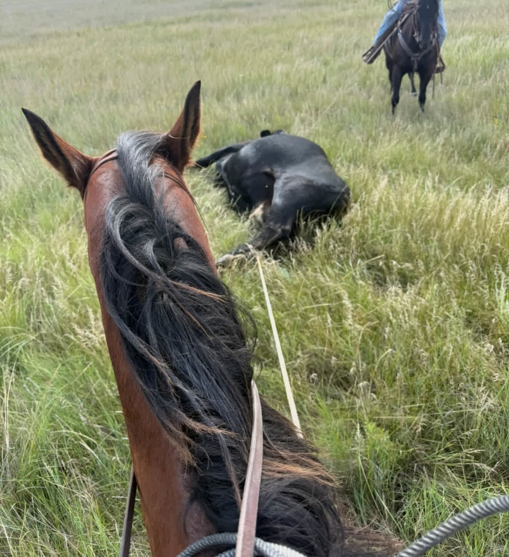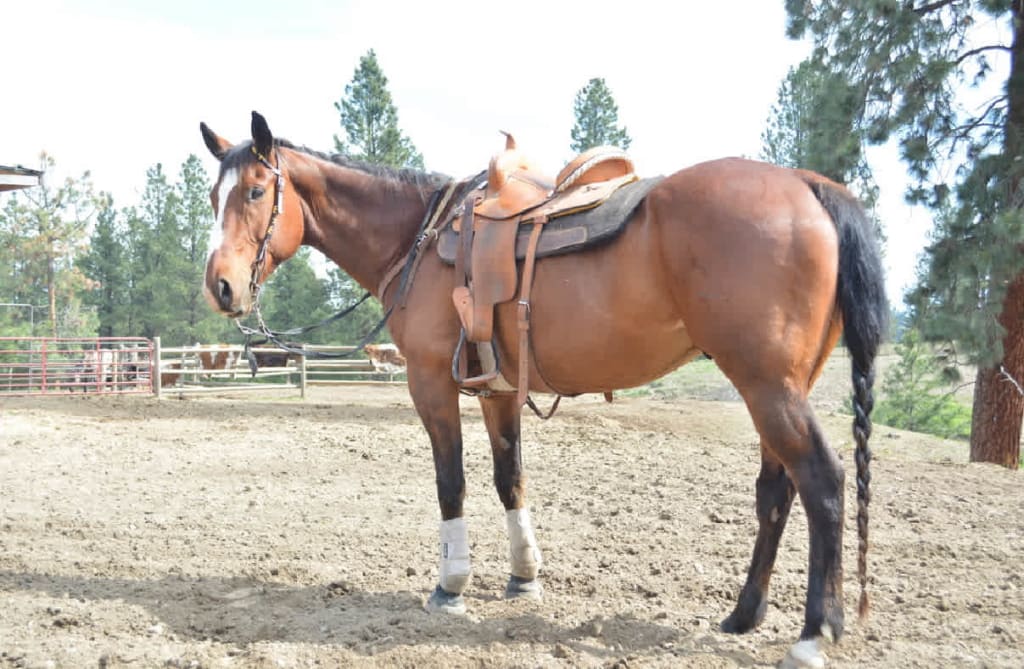 Dean is a 9 year old gelding. He's been my main mount at the pasture this summer and handled everything I've thrown at him. From moving, sorting, roping and doctoring cows to trailer loading bulls on the end of a rope. A pleasure to ride big miles. A young girl also lightly started on barrels, poles, and jumps. Straight legs, good feet, great for farrier.