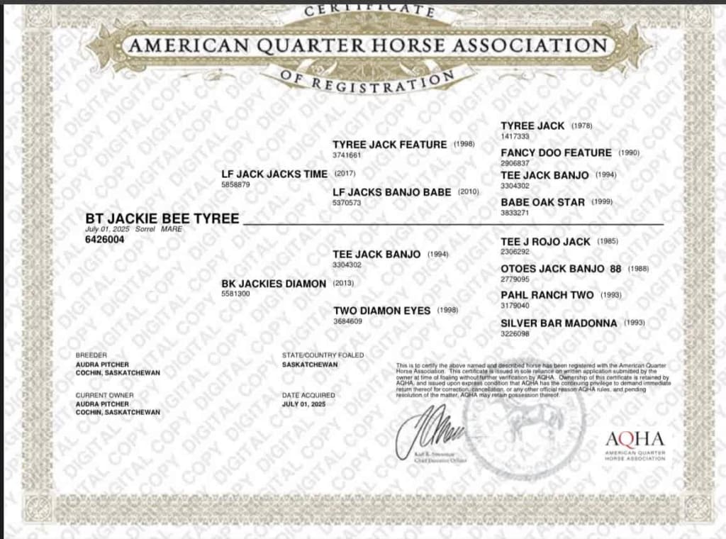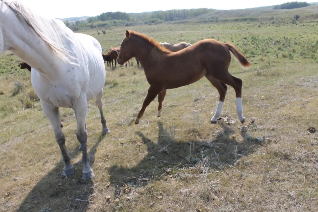 Go all day with this one. She will finish out about 15hh. Really nicely put together filly with a huge hip and nice shoulder. She would do well in the roping pen, community pasture or any other heavy riding discipline.