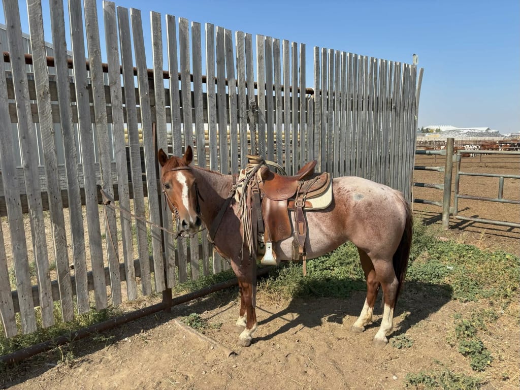 This pretty red roan mare is a pleasure to be around. Very cowy stops hard on a cow, done alot of ranch roping, anybody can ride her, kids, adults. This mare can be tender on her front feet when turned out on grass, but otherwise she is okay with good shoeing.