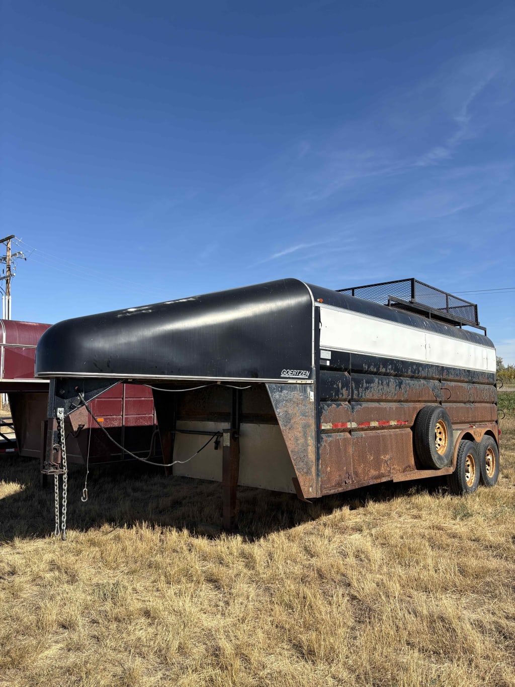 1995 Goertzen 18Ft Stock Trailer, two 7000 pound axles, two compartments, tire size 235/85R 16 VIN number 2WZCC182XS0006793