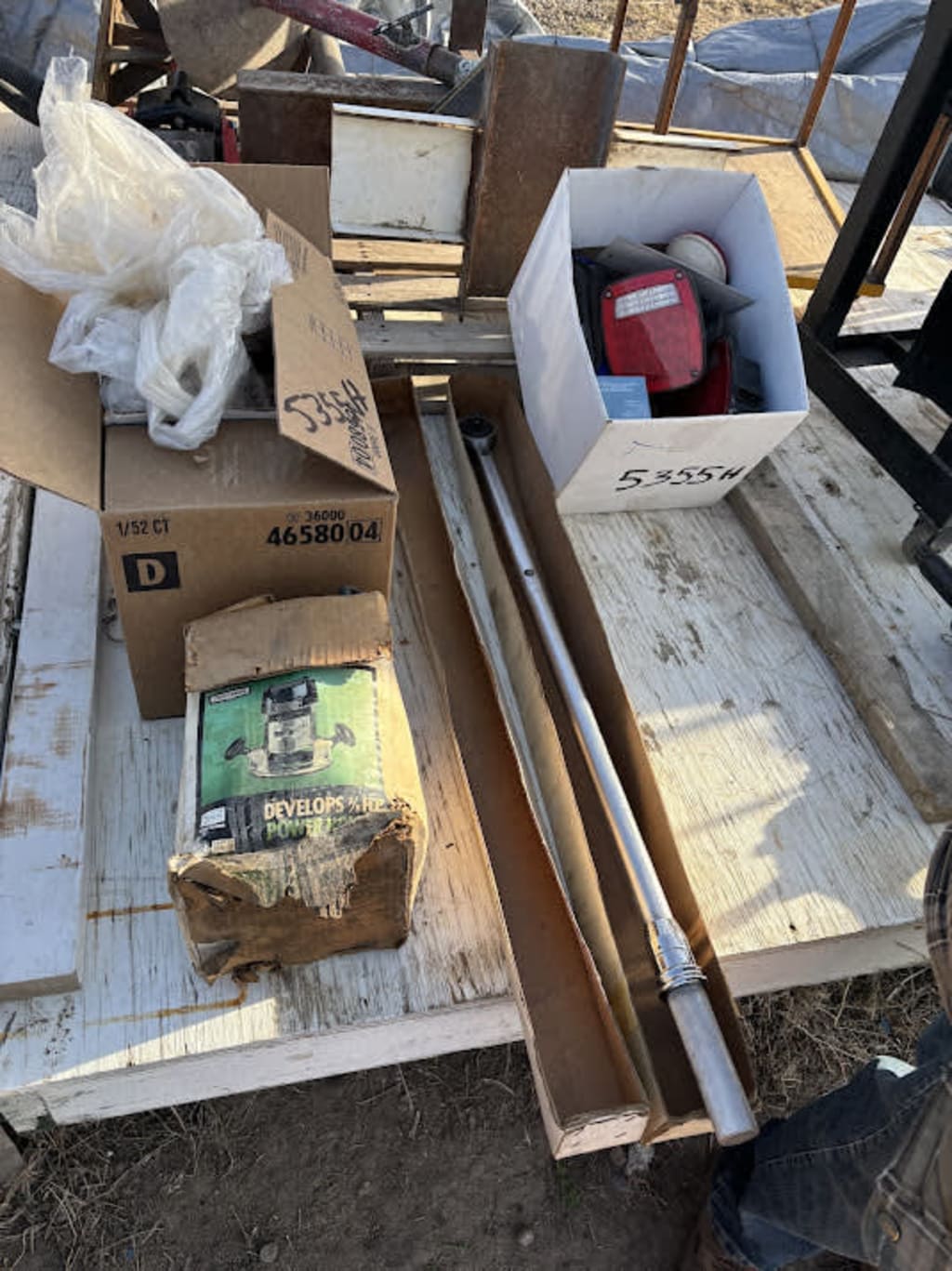 Box of Equipment Service Manuals, 600ft-lb Torque Wrench, Box of Trailer and Truck Lights, Router