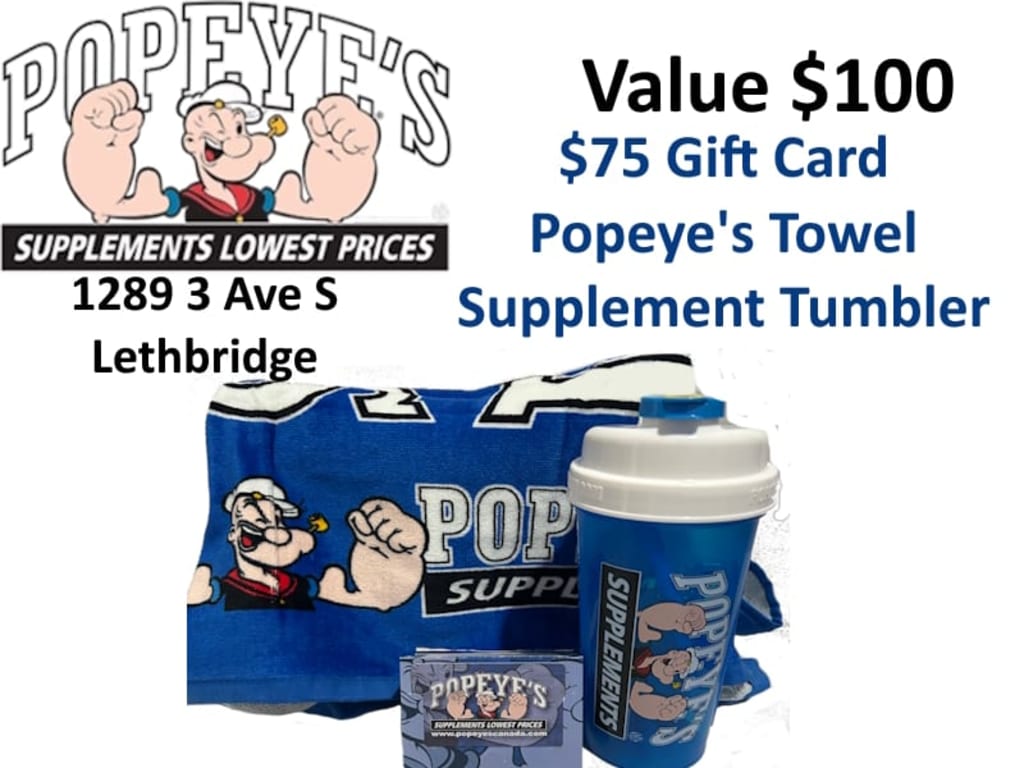 $75 Gift Card, Supplement Tumbler, Popeye's Towel.