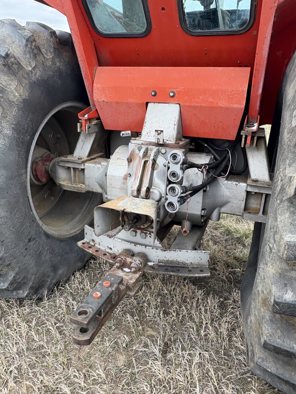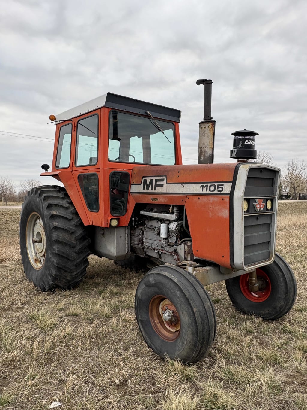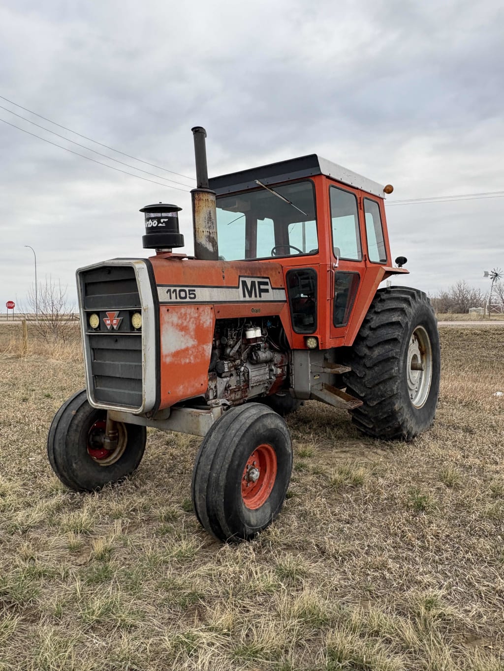 Massey Ferguson 1105 tractor 105 hp, three gear hi/low, 5269 hour showing, 540 PTO, two hydraulic outlets Front tires 11.00–16, back tires 23.1–34 ser#9B 40968
